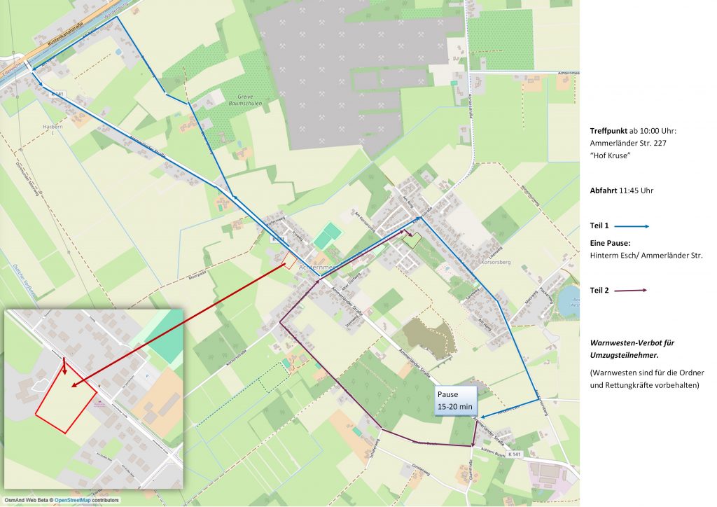 Der erste Abschnitt (Blau) führt uns Richtung Kanal und Am Denkmal, zurück über die Ammerländer Straße. Danach durch den Ort und über Korsorsstraße und Korsorssberg zur einzigen Pause Ecke Hinterm Esch/Ammerländer Straße: Die Pause dauert ca. 15-20 Minuten,
